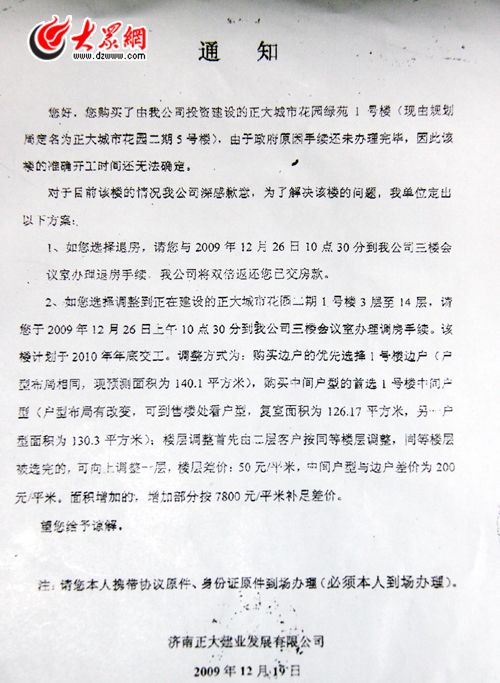 23日下午,大眾網記者收到了業主王小姐發來的《通知》的傳真件。在《通知》中,“樓坑坑”的開發商——濟南正大建業發展有限公司就目前5號樓遲遲未開工建設給大家造成的困擾深感歉意,并把問題歸因于“政府原因”,表示準確的開工時間至今仍然無法確定。同時,《通知》明確提出了兩種解決方案:一,如果選擇退房,可于規定日期辦理退房手續,正大建業將雙倍返還已交房款。二,如果選擇調整到正在建設的正大城市花園二期1號樓3層至14層,可于規定日期辦理調房手續。正大建業在《通知》中給出了具體的調整方式:即在2010年底竣工交付的二期1號樓3至14層中,原購買邊戶的業主仍然可以選擇邊戶的住宅,購買中間戶型的業主可以選擇新樓中戶的住宅。