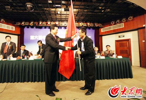 中共山東省委常委、宣傳部長李群向采訪團(tuán)代表人民網(wǎng)記者張巖授旗