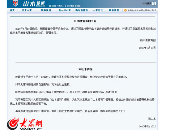 山木教育集團(tuán)官方網(wǎng)站發(fā)布宋山木辭職公告和其個(gè)人聲明。