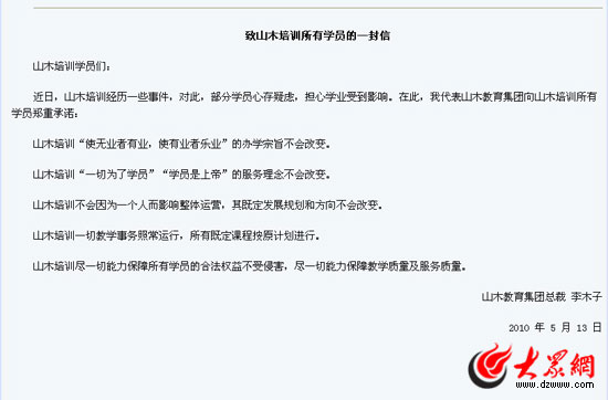 山木教育集團新總裁李木子在其官方網(wǎng)站發(fā)布公開信。