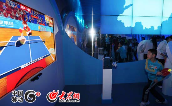 同樣的快樂也在山東館未來廳上演,這里的一臺可以與大屏幕對戰的乒乓球比賽吸引了眾多大孩子和小孩子,漂亮的女工作人員在耐心地給大家演示如何運用富含高科技的乒乓球拍,不過由于幾乎所有人都是第一次接觸這么特殊的乒乓球賽,和大屏幕對戰的游客一個個大敗而歸,不過展廳內的笑聲卻始終未斷。“機器人和乒乓球比賽都很好玩,可惜我玩的都不算好,嘿嘿!”前述四川小女孩笑著對記者說。