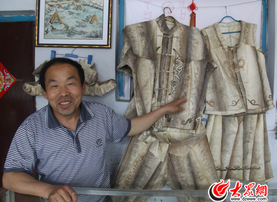 孫玉林向記者介紹自己制作的魚(yú)皮衣,兩件魚(yú)皮衣要用上數(shù)十條大馬哈魚(yú)的魚(yú)皮。
