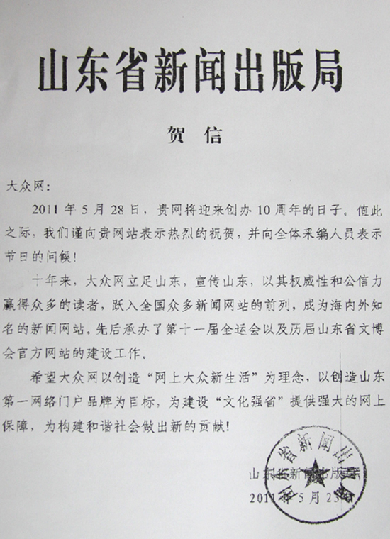 [提要] 2011年5月28日,貴網將迎來創辦10周年的日子,值此之際,我們謹向貴網站表示熱烈的祝賀,并向全體采編人員表示節日的問候!一年來,大眾網立足山東,宣傳山東,以其權威性和公信力贏得眾多的讀者,躍入全國眾多新聞網站的前列,