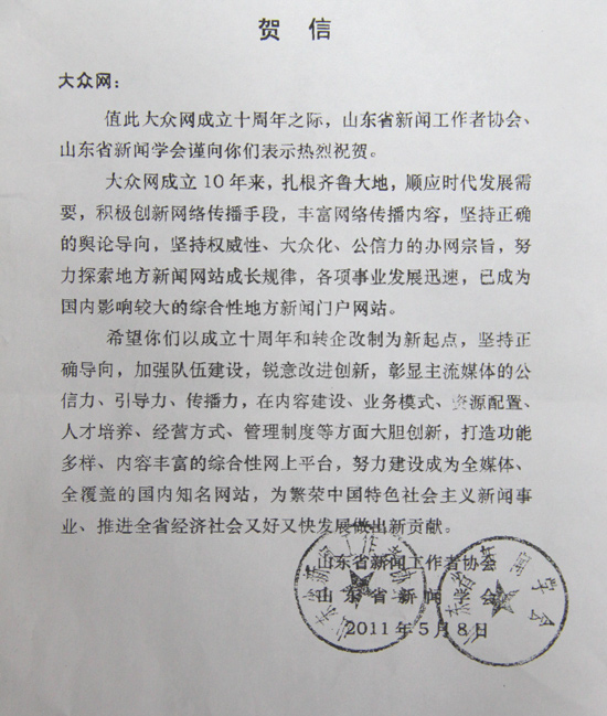 [提要]   值此大眾網(wǎng)成立十周年之際,山東新聞工作者協(xié)會、山東省新聞學會謹向你們表示熱烈祝賀。大眾網(wǎng)成立10年來,扎根齊魯大地,順應時代發(fā)展需要,積極創(chuàng)新網(wǎng)絡傳播手段豐富網(wǎng)絡傳播內(nèi)容,堅持正確的輿論導向,堅持權威性、