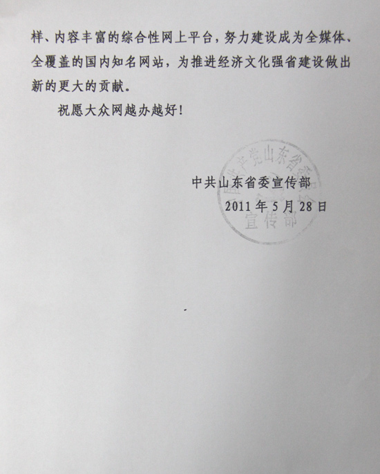 [提要]   值此大眾網成立10周年之際,謹致以熱烈祝賀!大眾網成立10年來,在省委、省政府的正確領導下,始終高舉旗幟,圍繞中心,服務大局,堅持正確輿論導向,堅持權威性、大眾化、公信力的辦網宗旨,積極探索地方新聞網站成長規律,