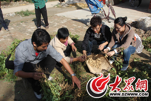 記者幫村婦摘花生。