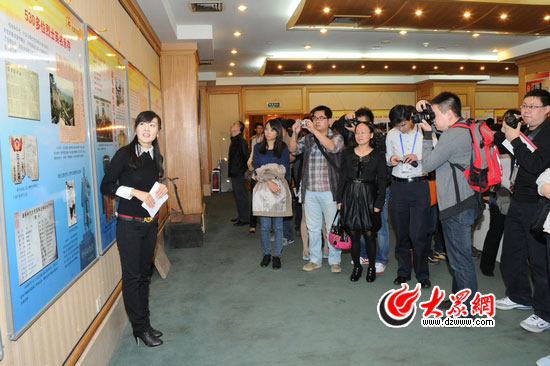 大眾網總編輯朱德泉陪同采訪團考察大眾報業集團報史館(燕雨 攝)