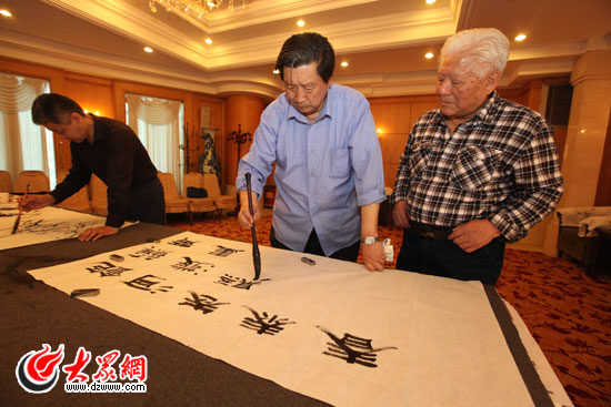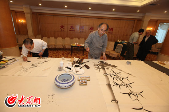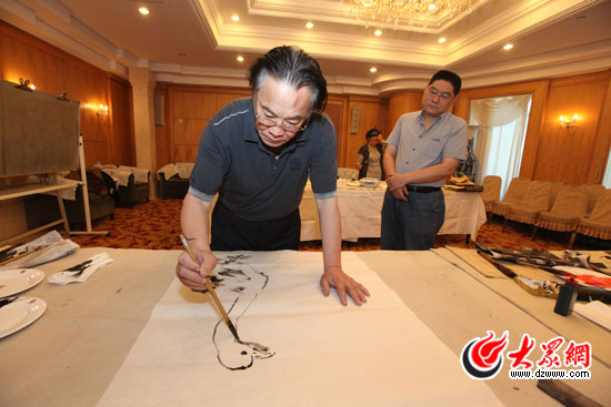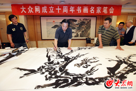 山東著名書(shū)畫(huà)家為慶祝大眾網(wǎng)成立十周年現(xiàn)場(chǎng)揮毫潑墨。