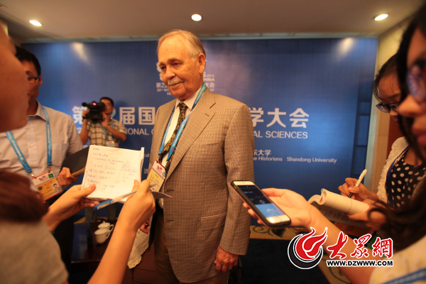 8月27日,第22屆國(guó)際歷史科學(xué)大會(huì)上,美國(guó)史學(xué)家鮑德威接受記者采訪。大眾網(wǎng)記者 王長(zhǎng)坤 攝