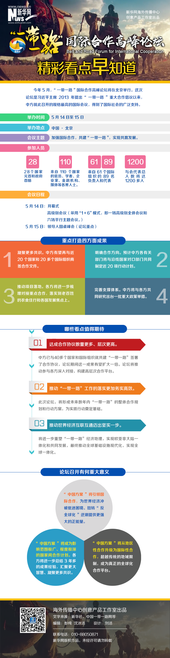 14日至15日,舉世矚目的“一帶一路”國(guó)際合作高峰論壇將在北京舉行,論壇主題為“加強(qiáng)國(guó)際合作,共建‘一帶一路’,實(shí)現(xiàn)共贏發(fā)展”。國(guó)家主席習(xí)近平將出席開(kāi)幕式并主持領(lǐng)導(dǎo)人圓桌峰會(huì),29位外國(guó)元首、政府首腦及聯(lián)合國(guó)秘書(shū)長(zhǎng)等3位重要國(guó)際組織負(fù)責(zé)人將出席圓桌峰會(huì)。[詳細(xì)]