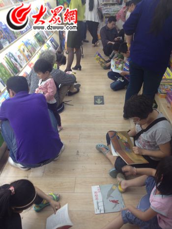 書店里席地讀書的孩子和家長。大眾網見習記者 毛德勛 攝