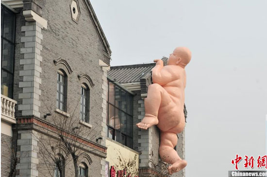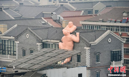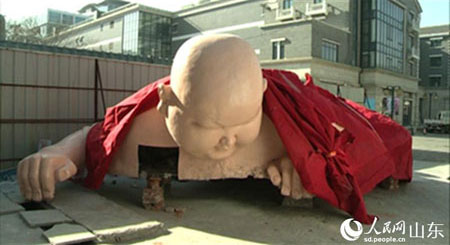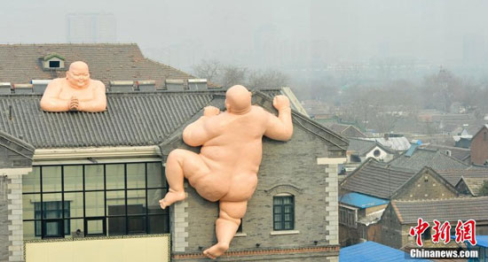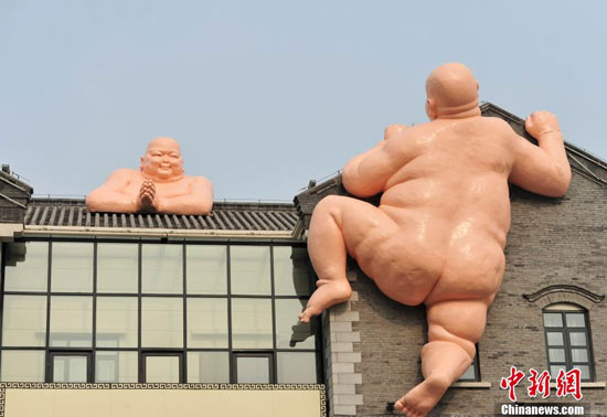 1月19日,中新網(wǎng)發(fā)了一組名為《攀房“裸佛”亮相濟(jì)南 似現(xiàn)實(shí)版“佛跳墻”》的圖片,圖片中,有兩個(gè)肉色的大型雕塑,一個(gè)“坐在”某兩層火鍋店的樓頂,一個(gè)攀附在墻上,做用力向上攀爬的姿勢(shì)。兩個(gè)雕塑造型都為年輕的胖子,其中坐在房頂?shù)呐肿佑薪赘撸p手合十,耳垂飽滿,很像一尊佛;爬墻的“胖子”有近六米高。因?yàn)榕缐Φ摹芭肿印北趁娉嗦悖栽诰W(wǎng)絡(luò)轉(zhuǎn)載和評(píng)論中,有網(wǎng)友將這兩尊雕塑稱為“裸佛”。