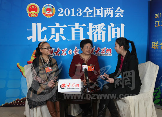 全國(guó)人大代表、曹縣磐石辦事處五里墩村黨支部書(shū)記、銀香偉業(yè)集團(tuán)董事長(zhǎng)王銀香(中)和全國(guó)人大代表、青島農(nóng)業(yè)大學(xué)科技處副處長(zhǎng)、山東布萊凱特黑牛科技股份有限公司董事長(zhǎng)董雅娟(左)做客大眾網(wǎng)北京直播室(特派記者 韋輝 攝)