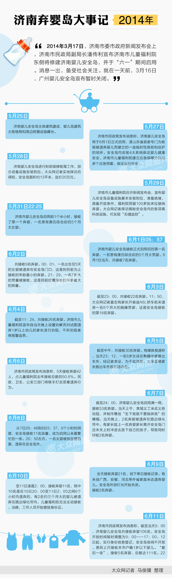 2014年6月11日,濟(jì)南市民政局發(fā)布消息稱(chēng),截至當(dāng)天9:00,濟(jì)南嬰兒安全島共接收棄嬰106名。安全島開(kāi)放時(shí)間暫時(shí)調(diào)整為9:00——17:00。12日起,實(shí)行身份信息登記,安全島夜間不開(kāi)放。原則上只接收本市戶(hù)籍1歲以下嬰兒。“最后一夜”,接收5名棄嬰,總數(shù)達(dá)111名。22:10分,一名10歲的腦癱女孩被遺棄在馬路中間,打破“年齡最大”紀(jì)錄。