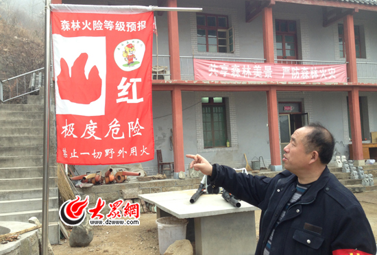 1月31日,沿著崎嶇的山路,大眾網記者來到實驗林場。沿途到處可見“嚴禁野外用火”等森林防火的標語,在重要路口懸掛著紅色森林火險等級的標志。張興告訴大眾網記者,從1月29日開始,實驗林場的火險等級就提升到了紅色。