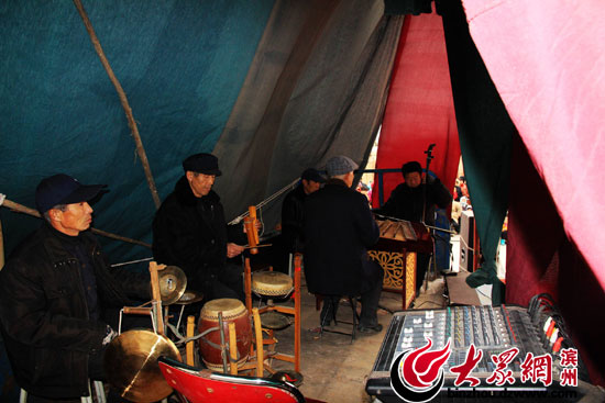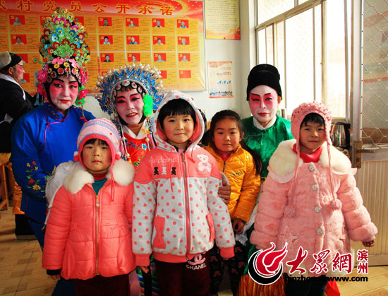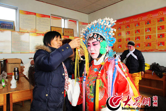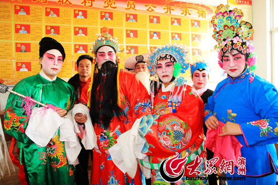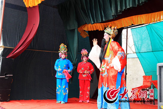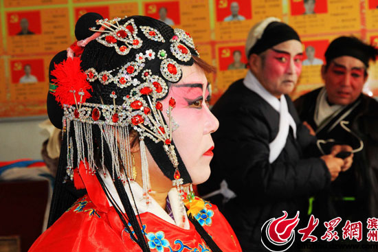 大眾網濱州2月5日訊(記者 賈礦中)2014年2月5日,在山東博興縣店子鎮劉耿村,土生土長的農民演員正在為農民群眾表演呂劇《回龍觀》。