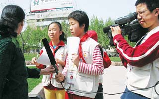 17日,槐蔭區(qū)營(yíng)東小學(xué)的學(xué)生們利用周末時(shí)間,借來(lái)學(xué)校的攝像 器材,在老師指導(dǎo)下到博遠(yuǎn)廣場(chǎng)了解市民對(duì)創(chuàng)城有何建議和意見(jiàn)。孩 子們說(shuō),他們準(zhǔn)備采訪一些市民,將這些意見(jiàn)和建議整理出來(lái),刻錄 成光盤,送到濟(jì)南創(chuàng)城委員會(huì),供工作人員參考。 本報(bào)記者 張剛 報(bào)道