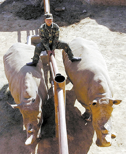 2月18日,濟南跑馬嶺野生動物世界的飼養員張偉教和“鎮園之寶”—白犀“非非”(右)、“南南”(左)在一起!胺欠恰薄ⅰ澳夏稀笔莾芍患嚷斆饔种馗星榈拇啤⑿坌韵#涍^飼養人員5年的精心照料 ,兩只龐然大物和飼養員結下了深厚感情。目前,飼養人員正在為填補全國犀牛繁育空白做準備。 新華社發