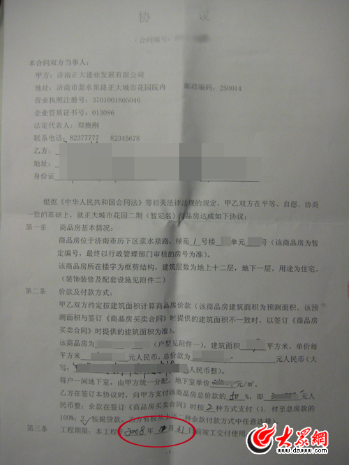 張先生告訴記者,他于2007年1月跟正大城市花園簽訂購房協(xié)議,購買2期的5號樓(原為綠苑1號樓),當時該樓并沒有預售證,不過開發(fā)商承諾會很快辦理,于是張先生就簽訂了購房協(xié)議,協(xié)議里約定:2008年12月31日之前交付使用。在之后幾個月里,張先生發(fā)現(xiàn)他買的樓遲遲沒有動工,就詢問開發(fā)商:自己的樓何時能開工?開放商對此解釋說,要先蓋早賣出樓盤,張先生的樓盤賣得晚,當然要蓋得晚。