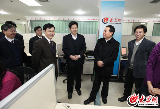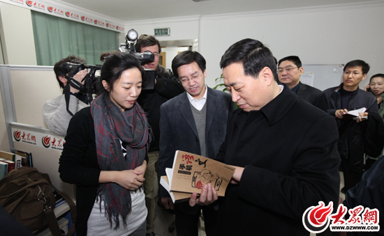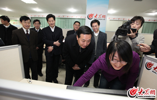 1月31日,山東省委常委、宣傳部長孫守剛在常務副部長姜鐵軍,副部長徐向紅,副巡視員王世農等省委宣傳部領導以及大眾報業集團黨委書記、董事長、總編輯傅紹萬,大眾報業集團社長、黨委副書記許衍剛,大眾報業集團黨委副書記、副總編輯李壯利,大眾報業集團黨委常委、副總編輯魏武,趙念民,郝克遠等領導陪同下,來到大眾網檢查指導工作,看望慰問網站工作人員,并通過大眾網向廣大網友拜年。(記者 曹亮 攝)
