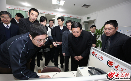 省委常委、宣傳部長孫守剛詳細了解齊魯手機報編發工作流程,并上網瀏覽眾眾微博,詳細詢問眾眾微博運行情況。(記者 曹亮 攝)