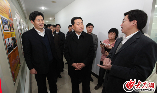 省委常委、宣傳部長孫守剛參觀大眾網宣傳欄、文化墻,詳細了解了大眾網組織架構。大眾網董事長、總經理林忠禮,大眾網總編輯朱德泉介紹了有關情況。(記者 曹亮 攝)