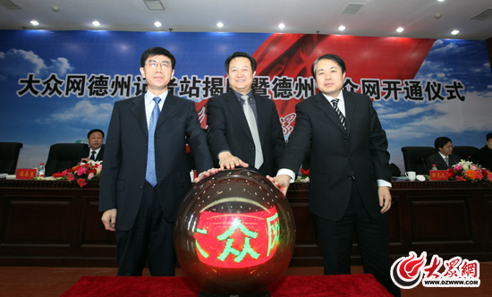 劉保聚、劉致福和郝克遠共同按下水晶球開通德州大眾網,吳翠云和傅紹萬為大眾網德州記者站揭牌。