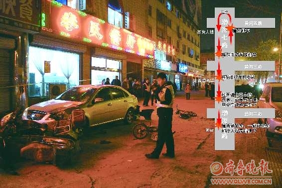2010年11月28日晚,肇事車連續多次碰撞后,在一家飯店門口停下。 (本報資料片)