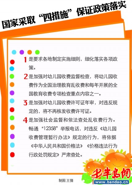在如何保證幼兒園收費(fèi)政策落實(shí)問題上,發(fā)改委相關(guān)負(fù)責(zé)人表示,將要求各地制定實(shí)施細(xì)則,細(xì)化落實(shí)各項(xiàng)政策;加強(qiáng)對幼兒園收費(fèi)監(jiān)督檢查,將幼兒園收費(fèi)作為全國治理教育亂收費(fèi)和每年開展的全國教育收費(fèi)專項(xiàng)檢查重點(diǎn)內(nèi)容之一。