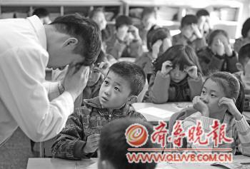 日前,山師附小二年級7班,來自山東省青少年視力低下防治中心的醫生們正在給孩子矯正做眼保健操中的不正確的方式。 本報記者 左慶 攝