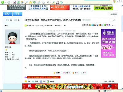 對這個結果,劉女士稱自己“冤得沒處去說理”。她告訴記者,自己2008年6月到這個服務區做清潔工,也對服務區內裝有監控的事很清楚,自己不可能在監控的監督下,還將撿到的錢包據為己有。“我憑良心講話,一個女人,哪會想得那么復雜,怎么會做這種事?”她對公司將自己解聘憤憤不平,“我撿了錢包,分文不少還給了人家,現在還把我開除了。真是好事做不得,做了好事也會成壞事……”
