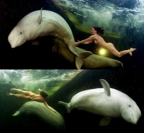 - 俄美女零度以下海水中全裸與白鯨嬉戲