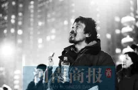 與該微博同步上傳的圖片中,一個中年模樣的男子,頭發(fā)略顯凌亂,蓄著胡須,身穿已經(jīng)掉色的藍色棉大衣,布滿黑漬的右手里拿著一瓶快要喝完的冰紅茶。