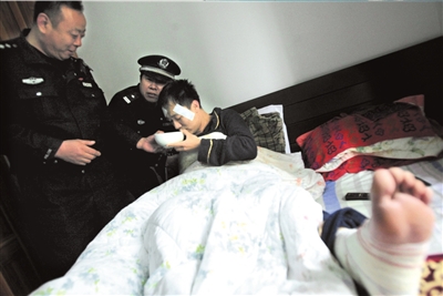 昨天,記者見到“拐杖哥”邸偉時,他正躺在床上休息,太陽穴處貼著散熱片,左腳露在被子外面,從小腿到腳踝仍然包著紗布。