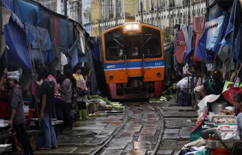 在火車即將到來前,小販們會快速將涼棚和出售的產品搬離收回,讓火車呼嘯而過。而購物者們也會短暫消失。火車過后,一切又恢復原樣,仿佛什么都沒發生一樣。每天,當地人在此出售地方特產,比如荔枝、榴蓮、芒果、新鮮海鮮、干辣椒等。這里還有許多獨特美食,比如油炸青蛙。