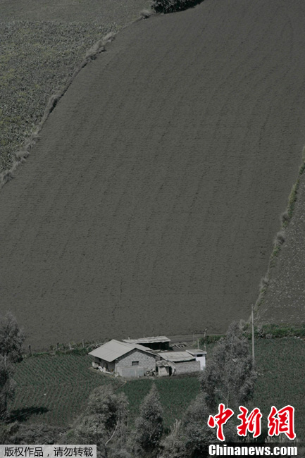 當地時間2012年8月19日,厄瓜多爾首都基多以南178公里的通古拉瓦火山發生噴發,距離火山較近的居民已經被緊急疏散。圖為被火山灰覆蓋的房屋。