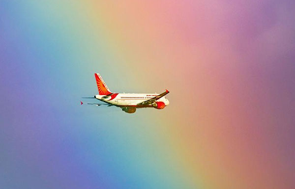 客機與彩虹“不期而遇” 畫面唯美夢幻