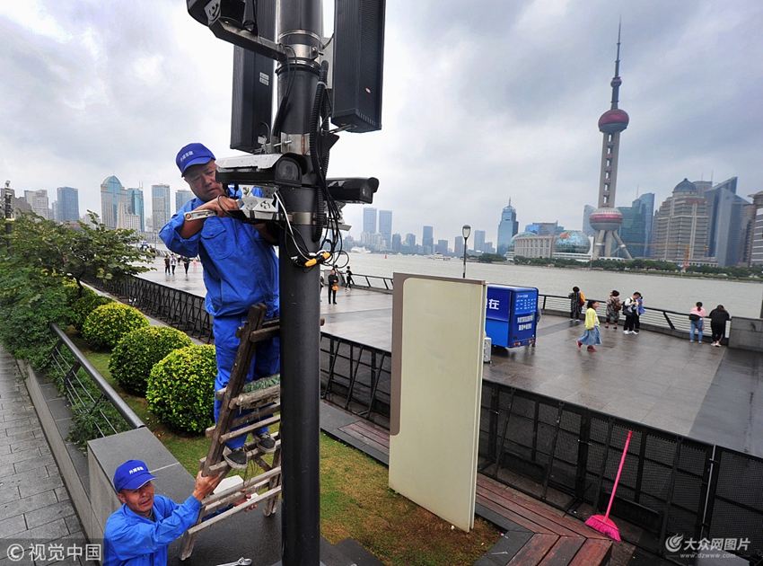 2018年10月5日,上海,今年第25號臺風“康妮”外圍環流當天起影響本市,今晨的外灘冷風颼颼,風力明顯增大,還不時有陣陣小雨飄來,觀景平臺上傘花朵朵,不少游客都紛紛增加了外套御寒,但體感仍有些陰冷。上海各區積極“備戰”,全力以赴做好防臺工作。上午,外灘風景區的工作人員對觀景平臺沿線功能桿上的設施支架進行巡查并進行加固,嚴防高空墜落,確保廣大游客安全。