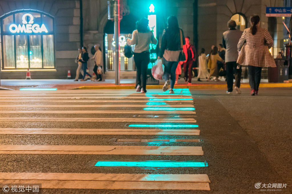 2018年10月10日,上海首條會發光人行道十一期間在外灘投入使用。當天傍晚在陳毅廣場附近看到,南京東路與中山東一路交匯處的兩側人行道上,發光地磚的顏色與行人信號燈顏色同步變化:綠燈時,發光地磚顯示為閃爍的綠色;紅燈時,發光地磚則切換為紅色。