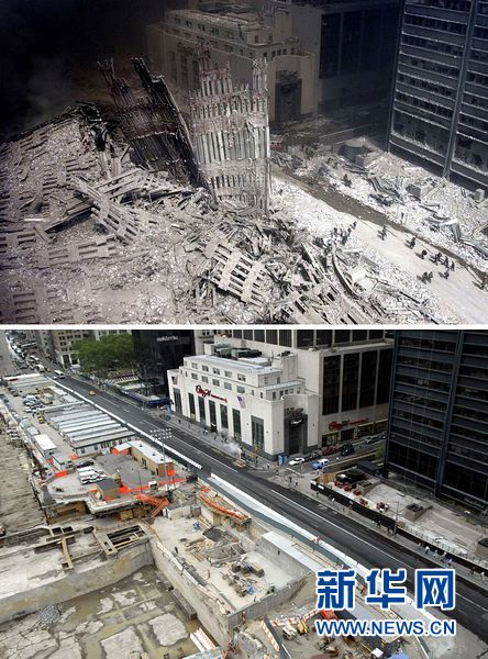 這是“9·11”事件發(fā)生近9個(gè)月后,遭受毀滅性襲擊的美國(guó)紐約世貿(mào)中心已經(jīng)從一片廢墟(上圖,攝于2001年9月11日)變成一個(gè)新的建筑工地(下圖,攝于2002年6月4日)。新華社發(fā)(程麗編輯)