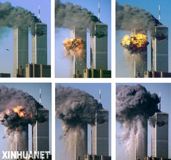 2001年9月11日,恐怖分子劫持了美國4架民航客機,其中兩架撞坍了紐約世貿中心“雙子大廈”,一架撞毀華盛頓五角大樓的一角,另一架墜毀。這一系列襲擊導致3000多人死亡,并造成數千億美元的直接和間接經濟損失。這是一架飛機撞擊紐約世貿中心“雙子大廈”南樓的拼版照片(2001年9月11日攝)。新華社發