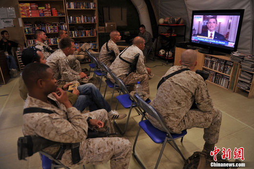美國總統奧巴馬在當地時間5月1日發表全國電視演講,宣布“基地”組織領導人烏薩馬·本·拉丹已被打死。 圖為駐阿美軍某團士兵關注奧巴馬演講的電視新聞。