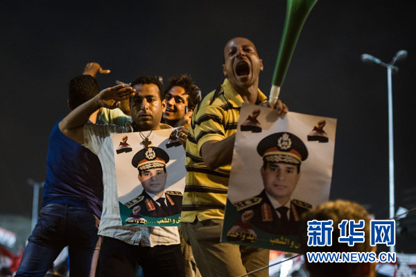 7月3日,在埃及開羅,反穆爾西民眾在解放廣場慶祝。埃及國防部長塞西3日晚發表全國電視講話,宣布提前舉行總統選舉、由最高憲法法院院長暫行總統職權。 新華社記者李木子攝