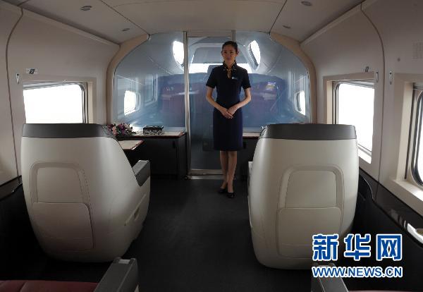 資料圖片:這是6月12日拍攝的參加試運行的京滬高鐵VIP觀光車廂女乘務員。近日,京滬高鐵司乘人員開始投入全線試運行。新華社發(鈕一新 攝)