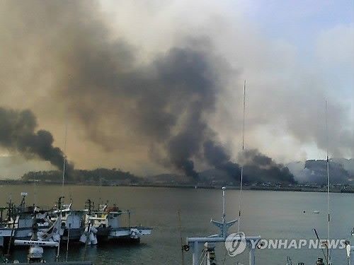 炮擊后硝煙彌漫的延坪島(來(lái)源 韓聯(lián)社)