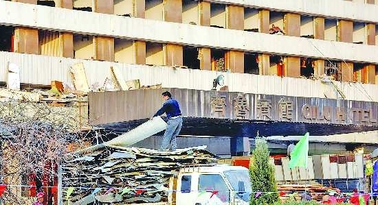 本報1月13日訊(記者 李飛 實習(xí)生 任輝)從12日起,已經(jīng)有25年歷史的齊魯賓館已開始拆除。現(xiàn)場施工人員透露說,近期,齊魯賓館老樓可能進行原地爆破。這座曾經(jīng)的地標(biāo)性建筑,將用這種方式向人們告別,向風(fēng)雨相伴25年的這座城市告別。 13日下午,記者在位于經(jīng)十路與千佛山路交叉口東南角的齊魯賓館看到,四臺大型挖掘機正在齊魯賓館樓前緊張施工,附屬樓基本被拆除完畢,樓前一片廢墟,到處堆積著磚頭、瓦礫和彎彎曲曲的鋼筋。賓館周圍廣場上的樹木已經(jīng)被移去,只剩下堆積著的一些建筑材料。還有一些施工人員正在老樓上進行著清理工作。 現(xiàn)場施工方一名自稱負責(zé)安全工作的人士告訴記者,齊魯賓館老樓的拆除工作是從12日下午開始的,目前拆的主要是齊魯賓館的附屬樓。“配合齊魯賓館的爆破,做清障工作,一個星期左右可以完成。”該人士透露,近日北京方面的爆破專家已經(jīng)做好了爆破方案,齊魯賓館老樓有望進行爆破清理,近期相關(guān)部門將會發(fā)布公告。“協(xié)調(diào)周圍住戶,通知爆破時間等。”該人士說,目前齊魯賓館內(nèi)已經(jīng)開始為爆破做準(zhǔn)備工作,齊魯賓館拆除后,不建新樓,而是建一個和酒店配套的大型超市。隨后記者欲向項目工程部進一步了解情況,但被婉拒。 “我曾在齊魯賓館的老樓住過,當(dāng)時是濟南最紅火的賓館,很懷念當(dāng)時的情景,現(xiàn)在它已經(jīng)成了歷史。”從附近走過的市民劉先生告訴記者。據(jù)了解,齊魯賓館主樓共有11層。1986年4月15日正式營業(yè),1989年即被國家旅游局評為全國首批三星級飯店,1992年榮升四星級。在當(dāng)時,齊魯賓館是濟南最高的建筑之一,也是全濟南檔次最高、設(shè)施最好的酒店。但1996年因為資金問題,160多米高的齊魯賓館二期成了爛尾樓,齊魯賓館也隨之衰落。