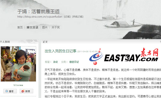東方網(wǎng)記者孫曉菲4月19日報(bào)道:今天凌晨3時(shí),復(fù)旦大學(xué)抗癌教師于娟靜靜地走了,她的生命時(shí)鐘就此定格在32歲。說起于娟的去世,她的生前好友方莉強(qiáng)似乎還有些難以接受,電話中,方莉強(qiáng)反復(fù)喃喃地對東方網(wǎng)記者說道:“她走得太突然太意外了……”