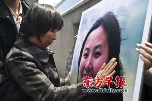 圖片說明:昨天,寶山殯儀館,復旦抗癌女教師于娟追悼會舉行,頭發(fā)花白的于娟母親輕撫著于娟的巨幅肖像。早報見習記者楊一