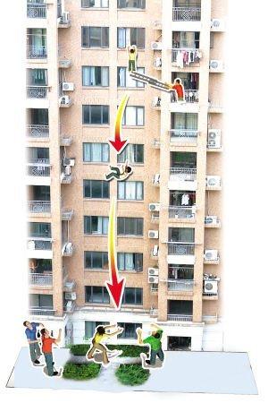 這時,住在9樓的一個住戶,搭了個梯子過去,可梯子太短,就在梯子剛伸到小女孩腳下的時候,小女孩突然掉了下去。